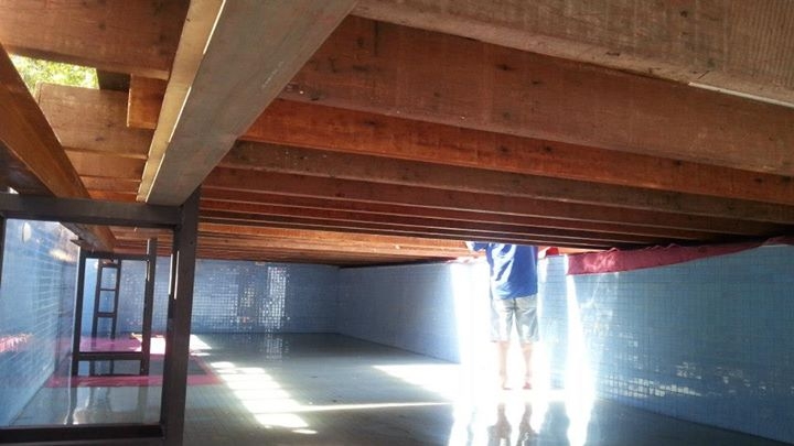 Montagem de toldo em área livre c/ cobertura cristal, colocação de piso em madeira para nivelamento do chão e coberto com carpete na cor encomendada pelo cliente.